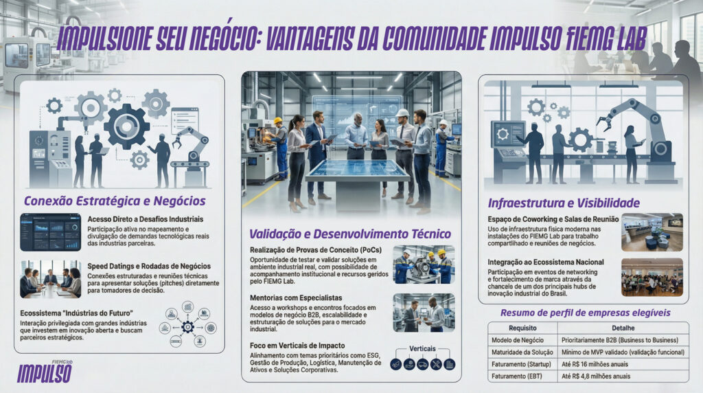 A Comunidade Impulso FIEMG Lab conecta indústrias a startups e soluções inovadoras, promovendo geração de negócios e parcerias estratégicas.