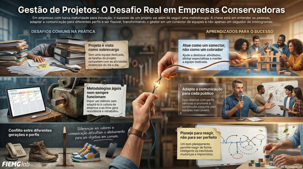Ao longo da minha trajetória profissional, tive a oportunidade de participar e liderar projetos muito diversos (dentro e fora da Indústria). Dessa vivência, adquiri aprendizados que hoje eu venho compartilhar com quem está à frente de algum projeto, especialmente em uma empresa mais conservadora e/ou com baixa maturidade de inovação, que esbarra também nos desafios de conectar diferentes perfis geracionais e de formações a uma mesma finalidade.
